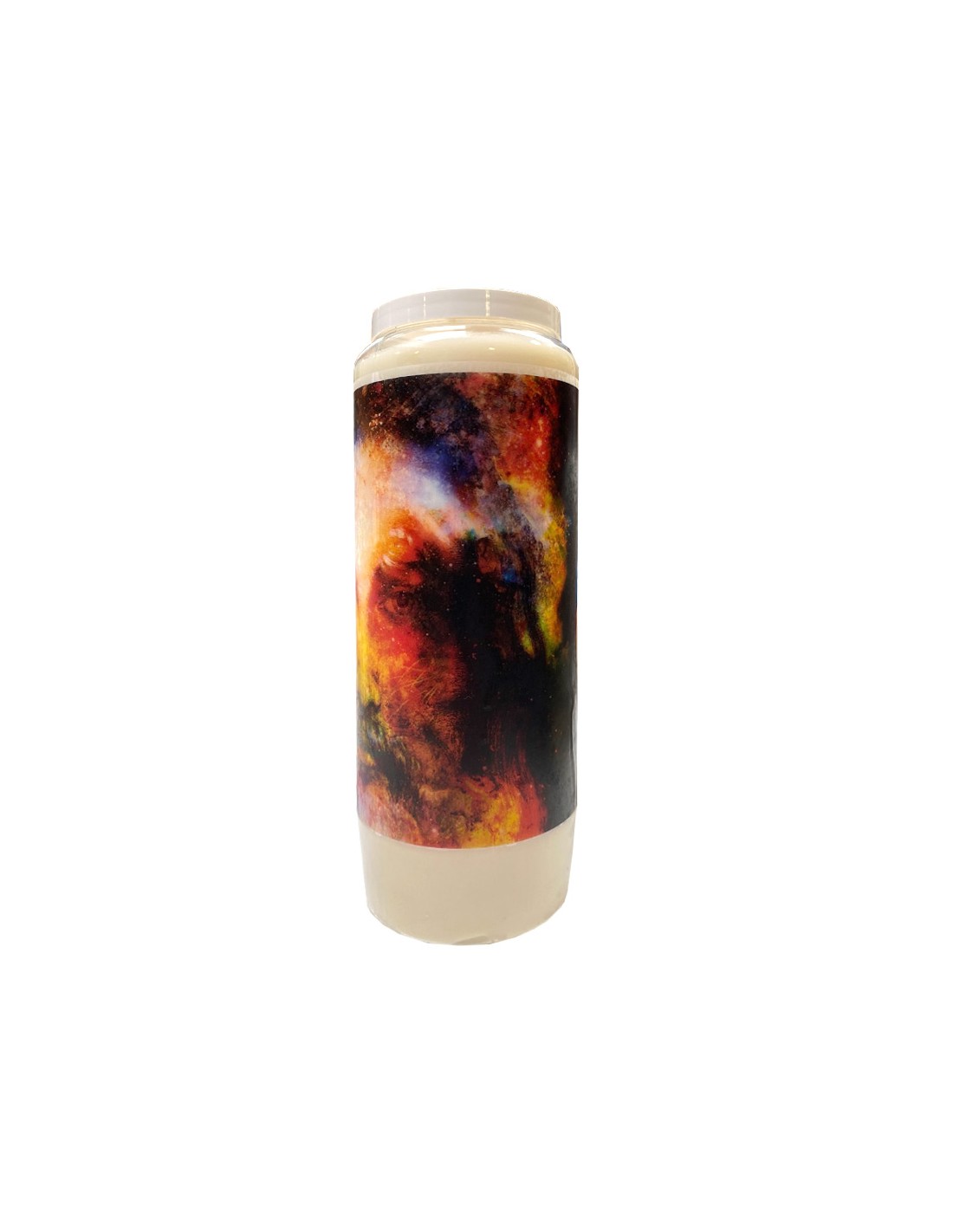 Pflanzliche, nach Sandelholz duftende Novene-Kerze mit einem Bild von Jesus Christus in moderner, farbenfroher Malerei. Eine perfekte Kombination zur Luftreinigung.