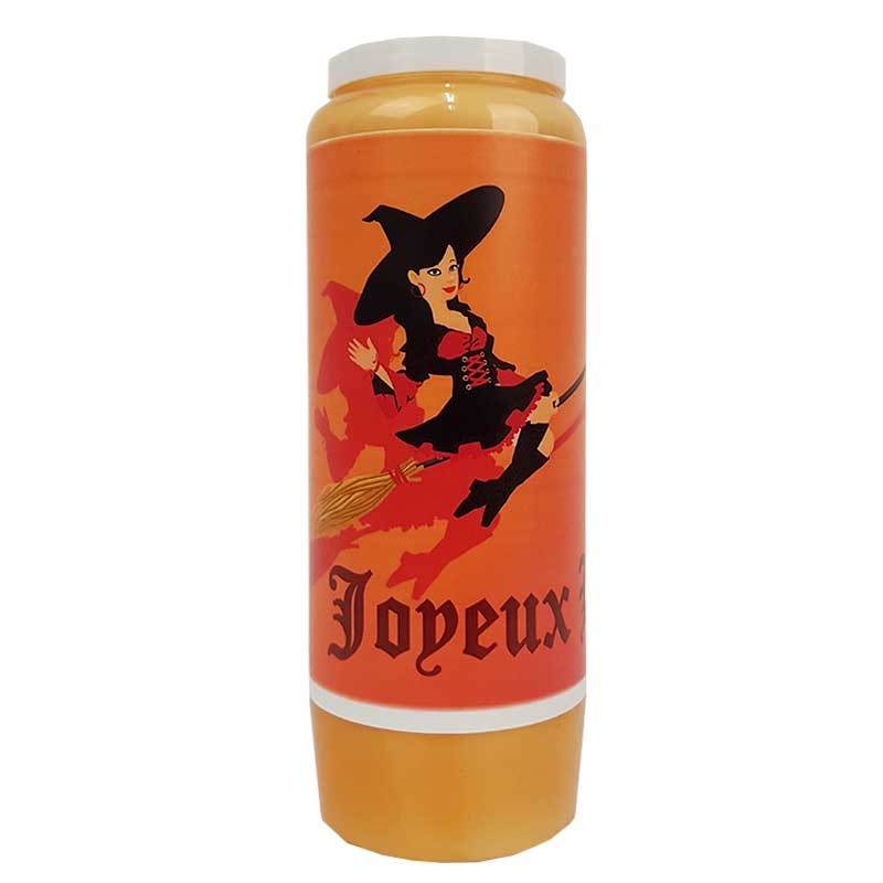 Orangefarbene Novenakerze mit Kürbissen im Wald und der Aufschrift Happy Halloween. Das Etikett ist lichtdurchlässig für einen Photophoreffekt.