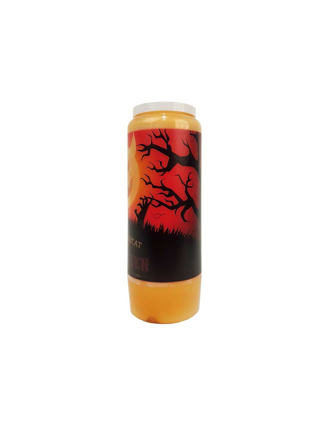 Orangefarbene Novenakerzen mit einer speziellen Halloween-Illustration, die einen Kürbismond zeigt, der einen gruseligen Wald beleuchtet! Das Bild ist transparent, um einen Kerzenglaseffekt zu erzielen.