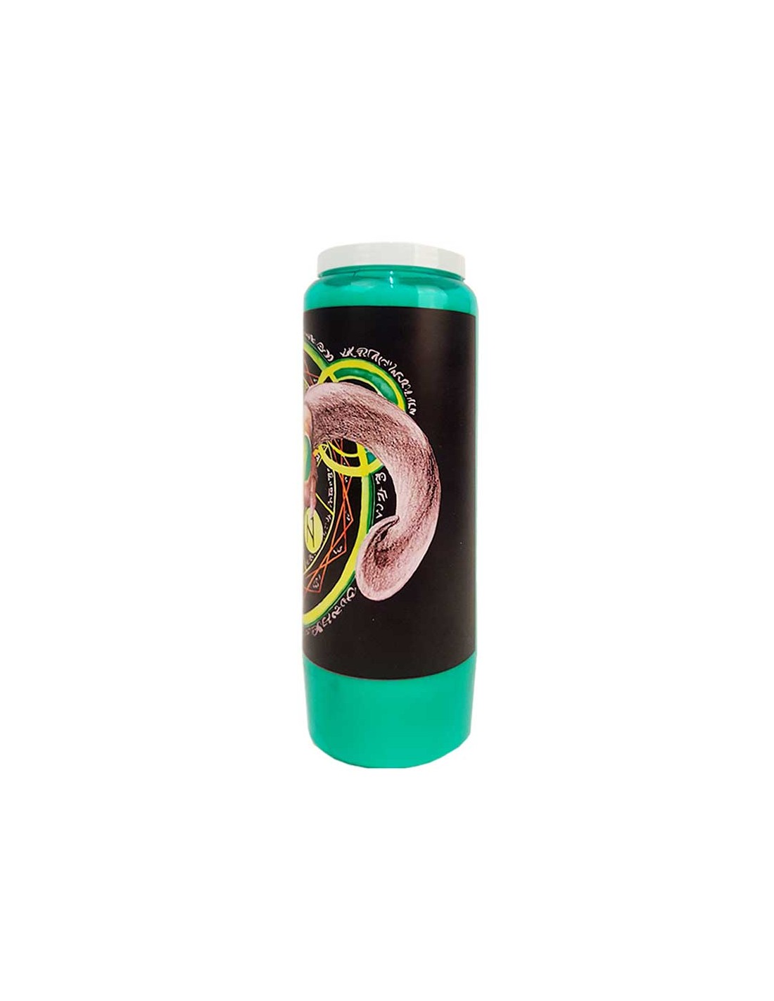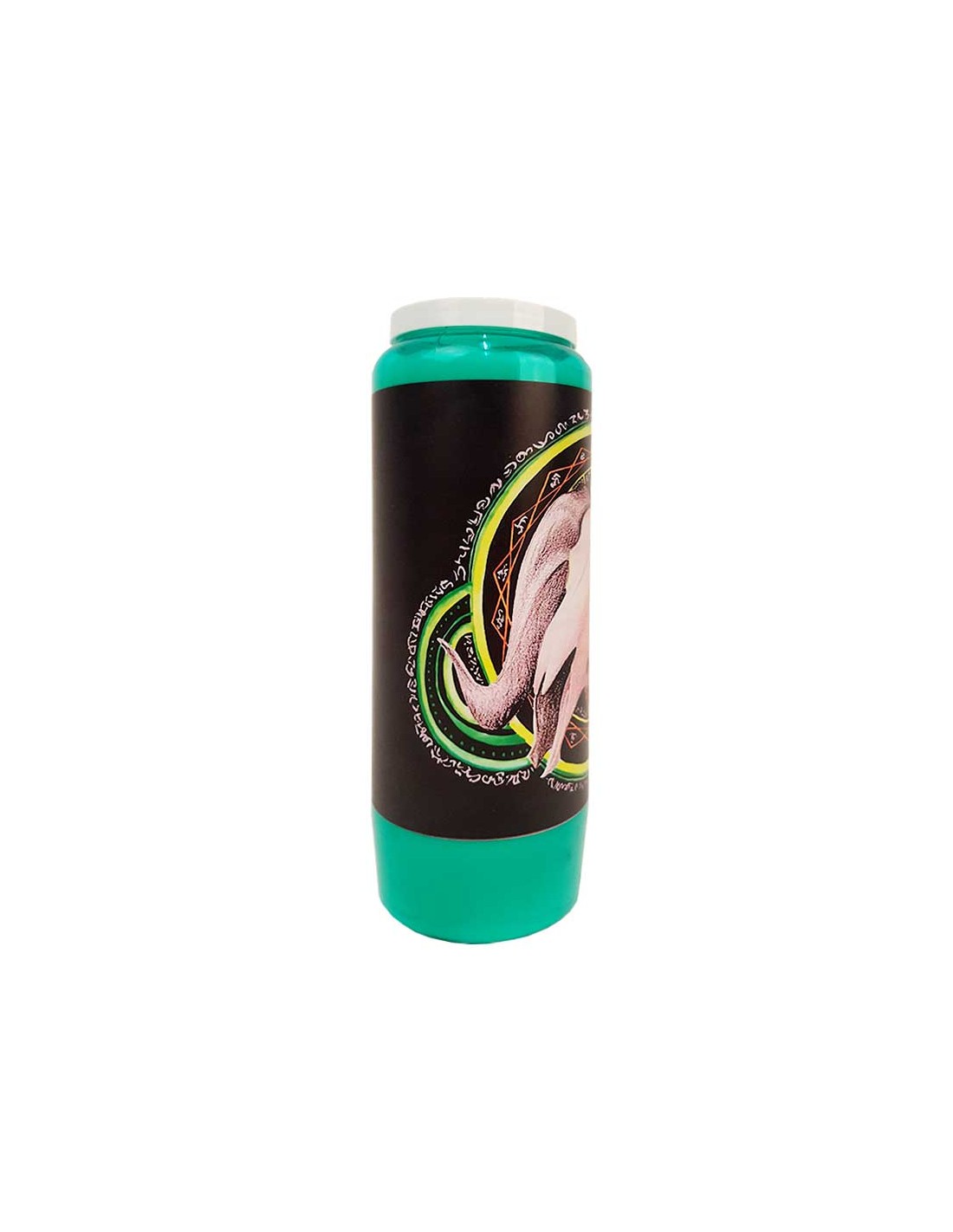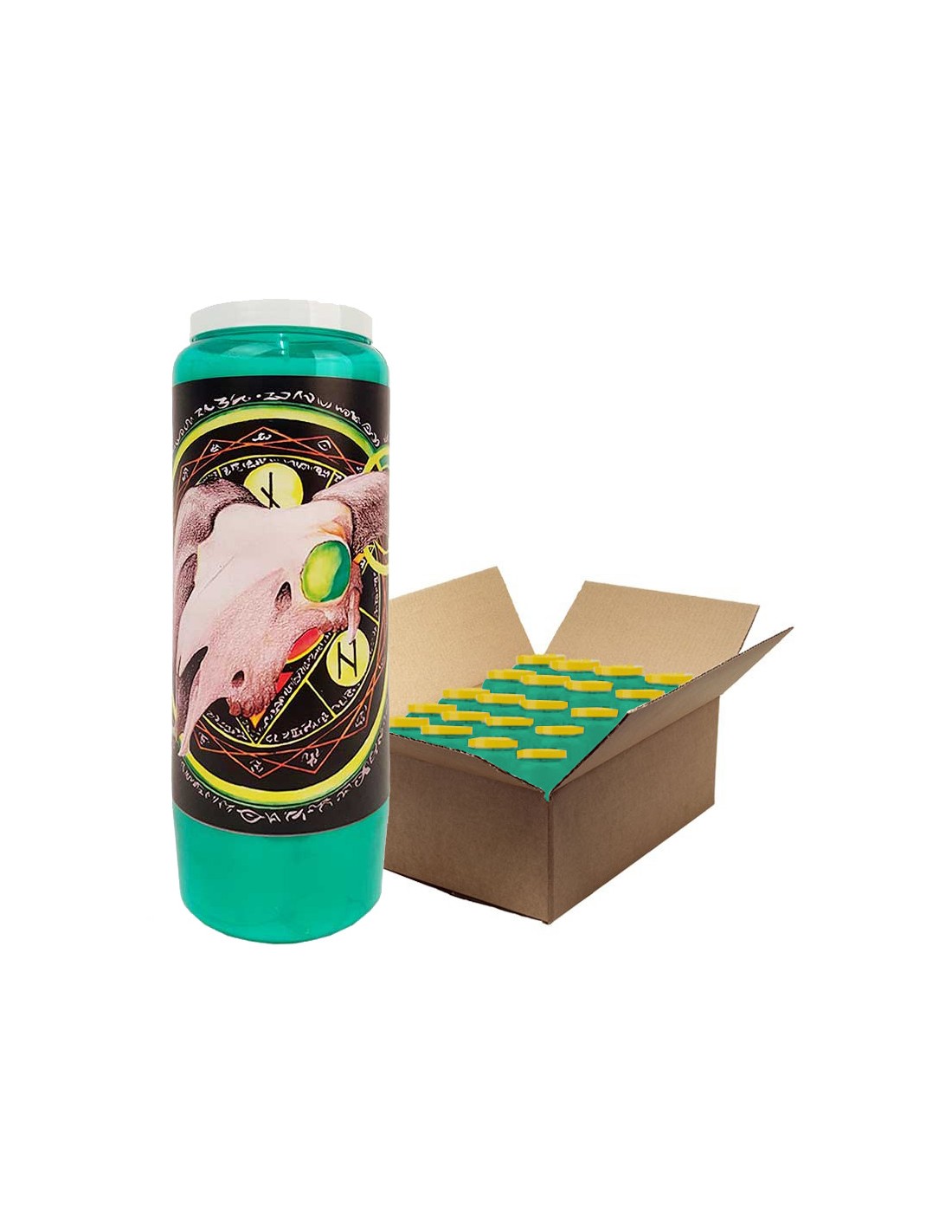 Grüne Novenakerzen mit einer speziellen Halloween-Illustration. Es zeigt einen Ziegenschädel auf einem Hintergrund aus magischen Runen.