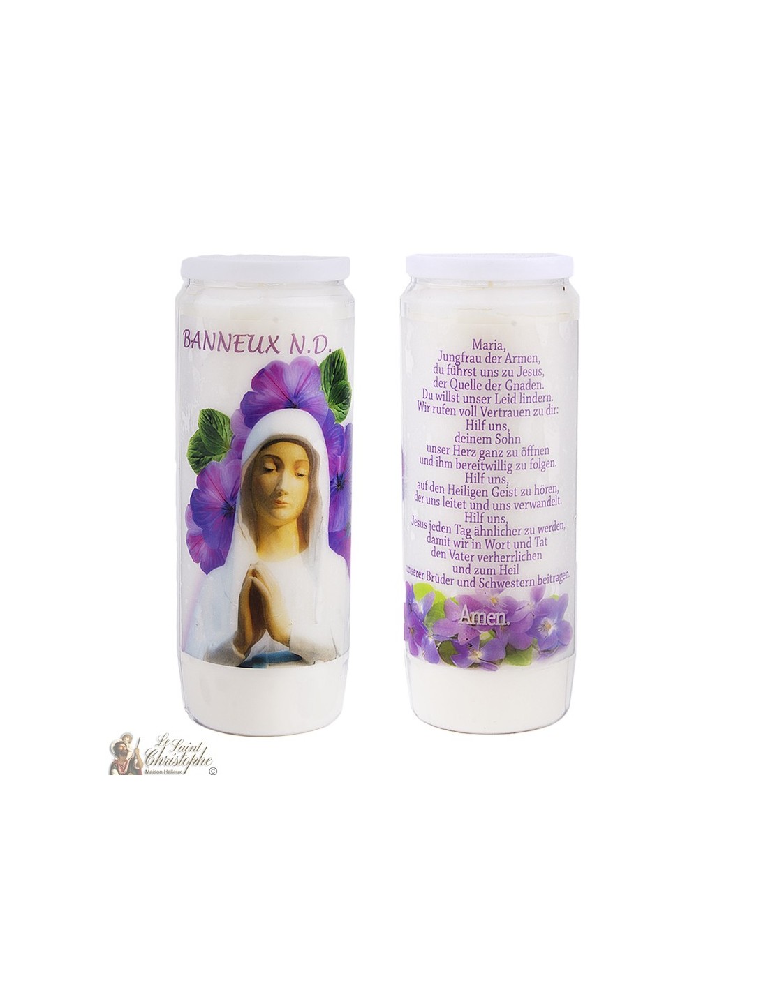 Gemüse-Novenkerze mit dem Bild der Jungfrau der Armen von Banneux Notre-Dame und Gebet auf der Rückseite in der Sprache Ihrer Wahl