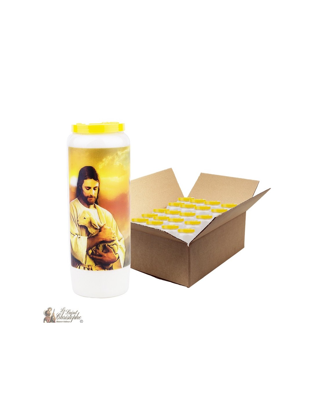 Schachtel mit 20 Novenekerzen mit dem Bild von Jesus Christus, der ein Lamm hält, auf der Vorderseite und einem Jesus gewidmeten Gebet auf der Rückseite.