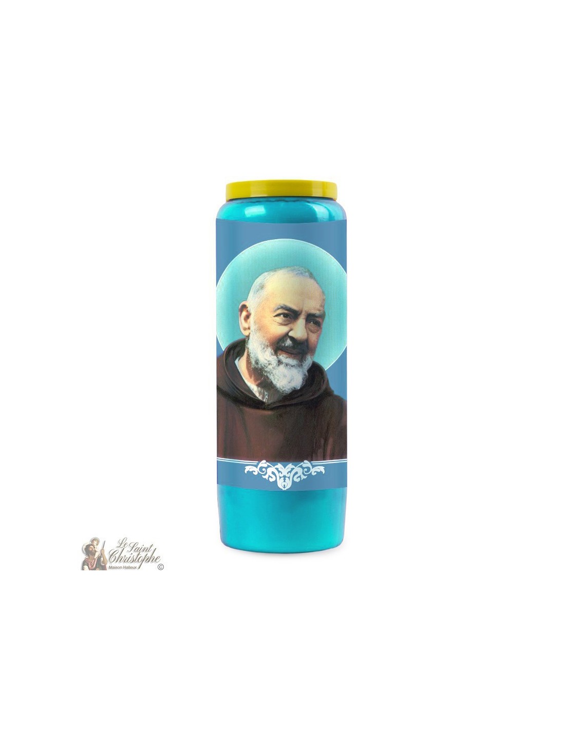 Blaue Novenkerze mit dem Bild von Padre Pio und einem ihm gewidmeten Gebet.