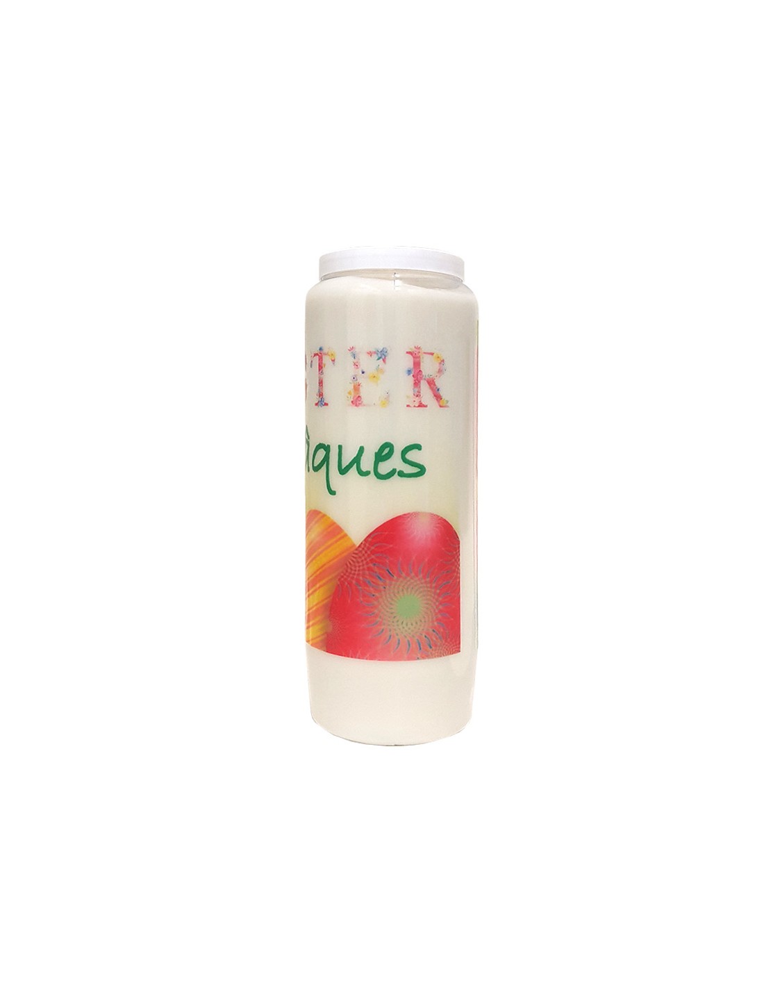 Neuvaine-Kerze aus Pflanzenöl mit einer schönen Illustration von Tulpen und Ostereiern für diese Festtage.