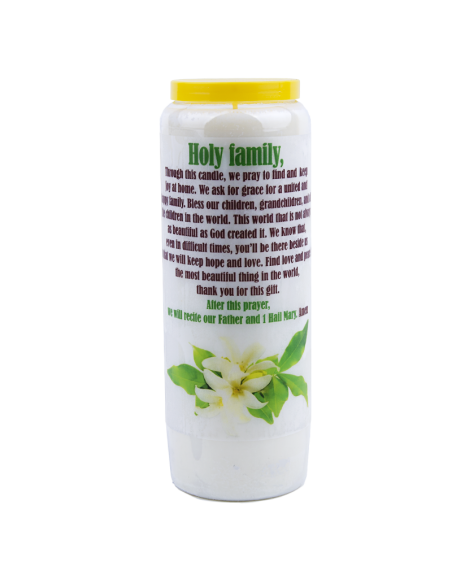 Schachtel mit 20 weißen Novenekerzen, mit dem Bild der Heiligen Familie und einem Gebet auf der Rückseite.