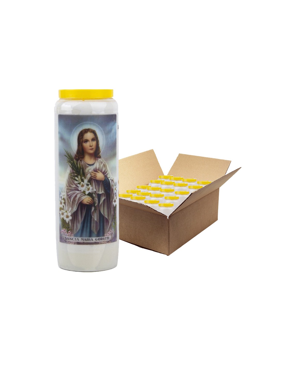 Schachtel mit 20 weißen Novenekerzen, gewidmet der Heiligen Maria Goretti mit Bild und Gebet auf der Rückseite.