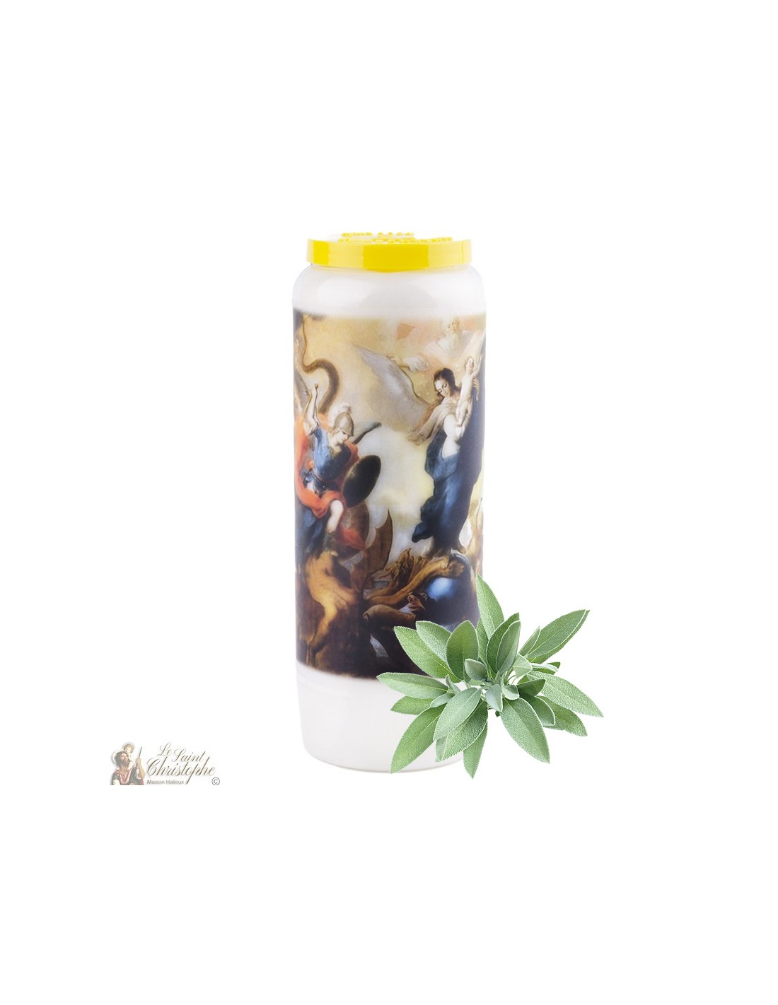 Weiße Novenakerze mit dem Bild von Heiligen und Engeln, die das Böse besiegen, und einem ihnen gewidmeten Gebet, duftend nach Salbei für eine intensive reinigende Wirkung.