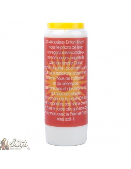 Weiße Novenenkerze mit dem Bild des Prager Jesulein und einem ihm gewidmeten Gebet.