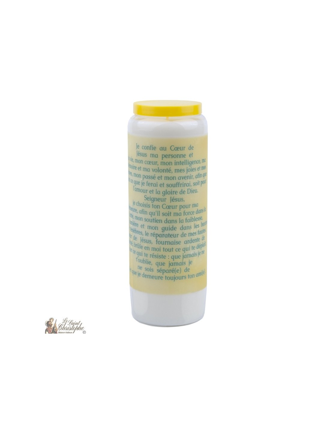 Weiße Novenkerze mit dem Bild des Heiligsten Herzens Jesu und dem ihm gewidmeten Gebet.