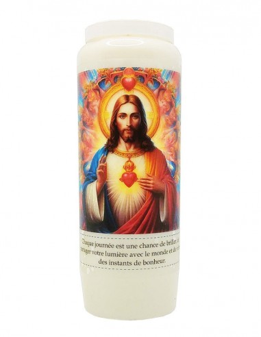 Novenekerze mit modernem Bild des Heiligsten Herzens Jesu, umgeben von einem Heiligenschein mit Engeln, in schillernden Farben, und Gebet auf der Rückseite.
