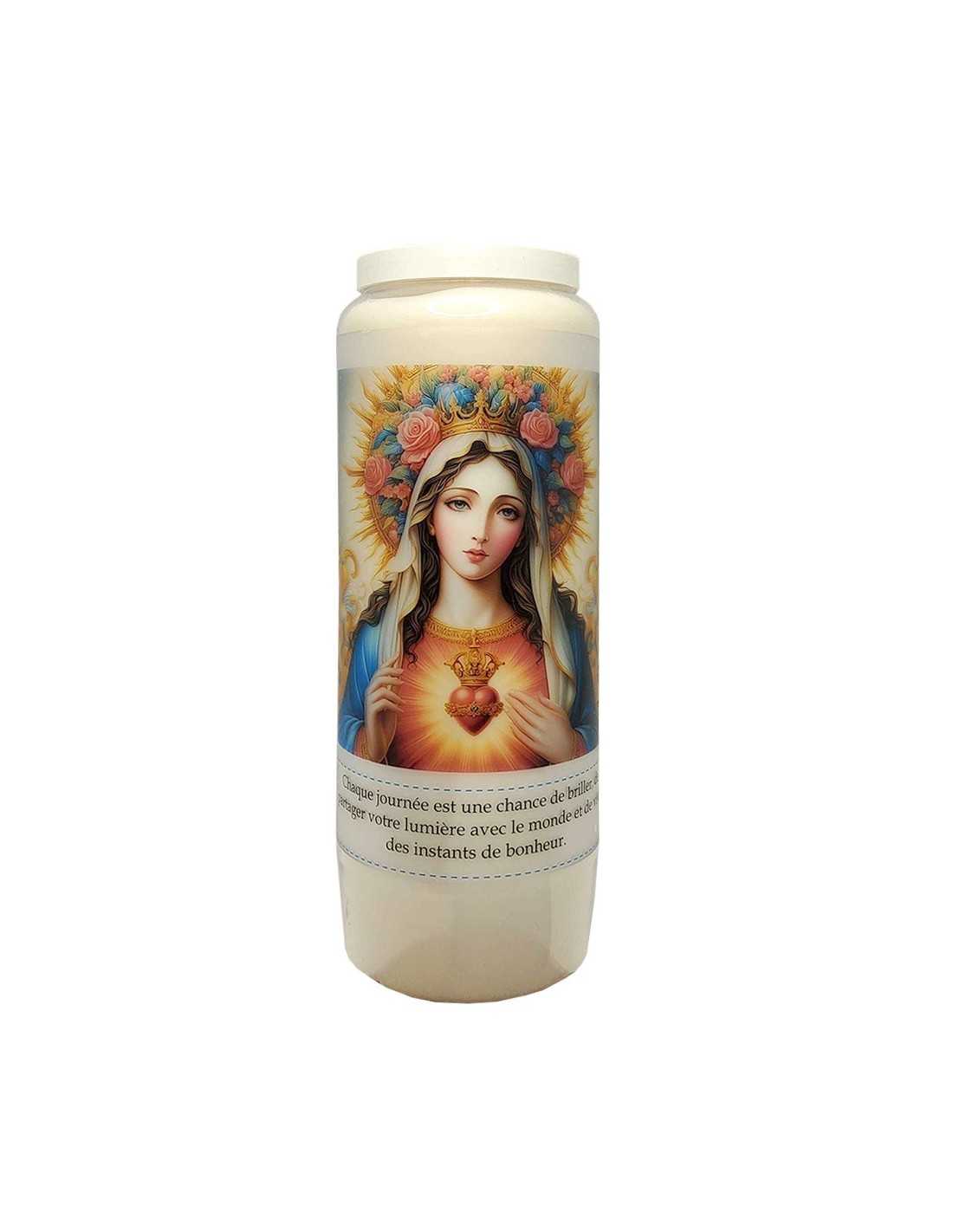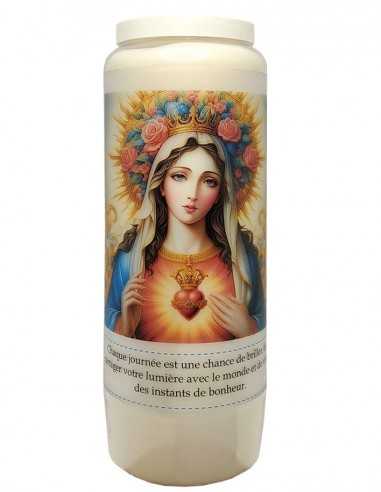 Novenakerze mit modernem Bild des Heiligsten Herzens Mariens auf einem Hintergrund aus schimmernden Farben und Gebet auf der Rückseite. Die Jungfrau Maria wird mit einem prächtigen Blumenkranz dargestellt, einem sonnenförmigen Kranz aus Rosen.