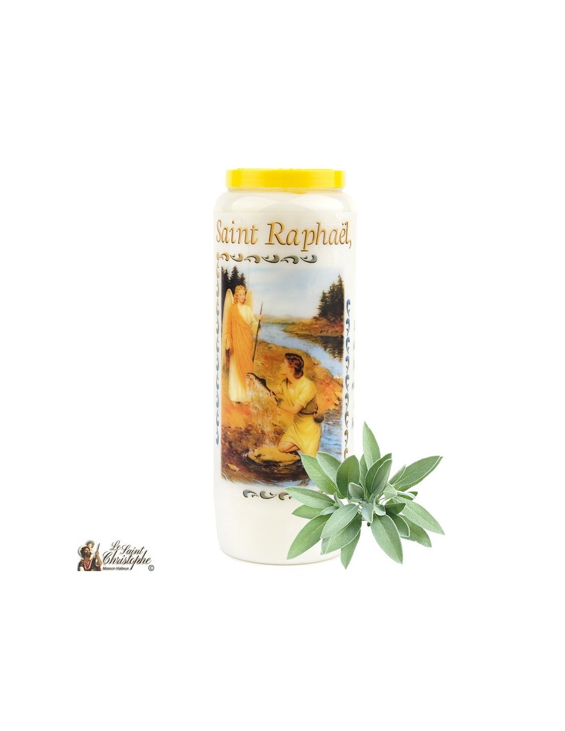 Gemüse-Novenkerze mit Gebetsbild zum heiligen Raphael und Salbei-Duft. Eine perfekte Kombination für eine Reinigung des Ortes.