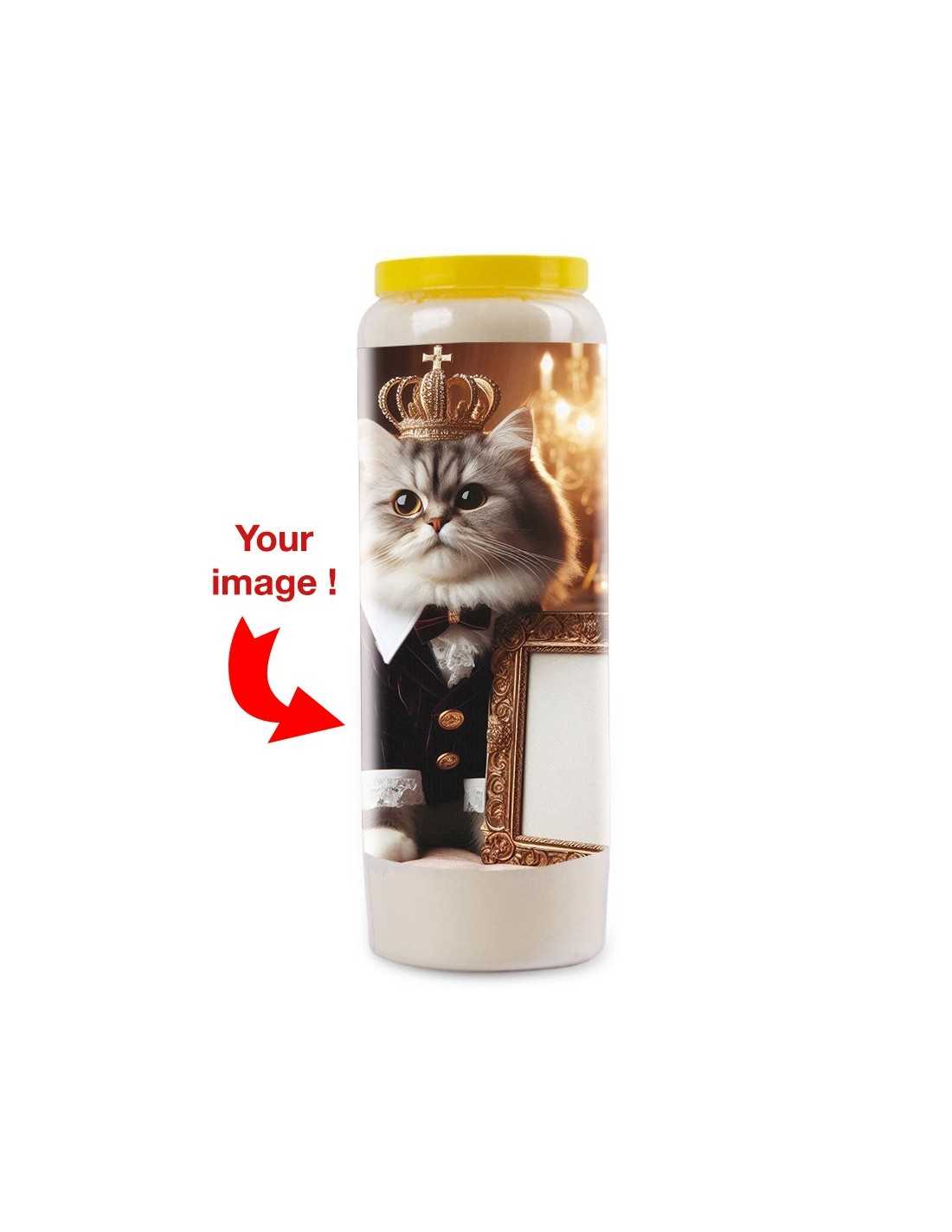 Give a touch of elegance and originality with this unique novena candle. A refined and fun nod for all cat lovers! This model features a medium-haired gray tabby cat in royal attire, with a customizable frame.