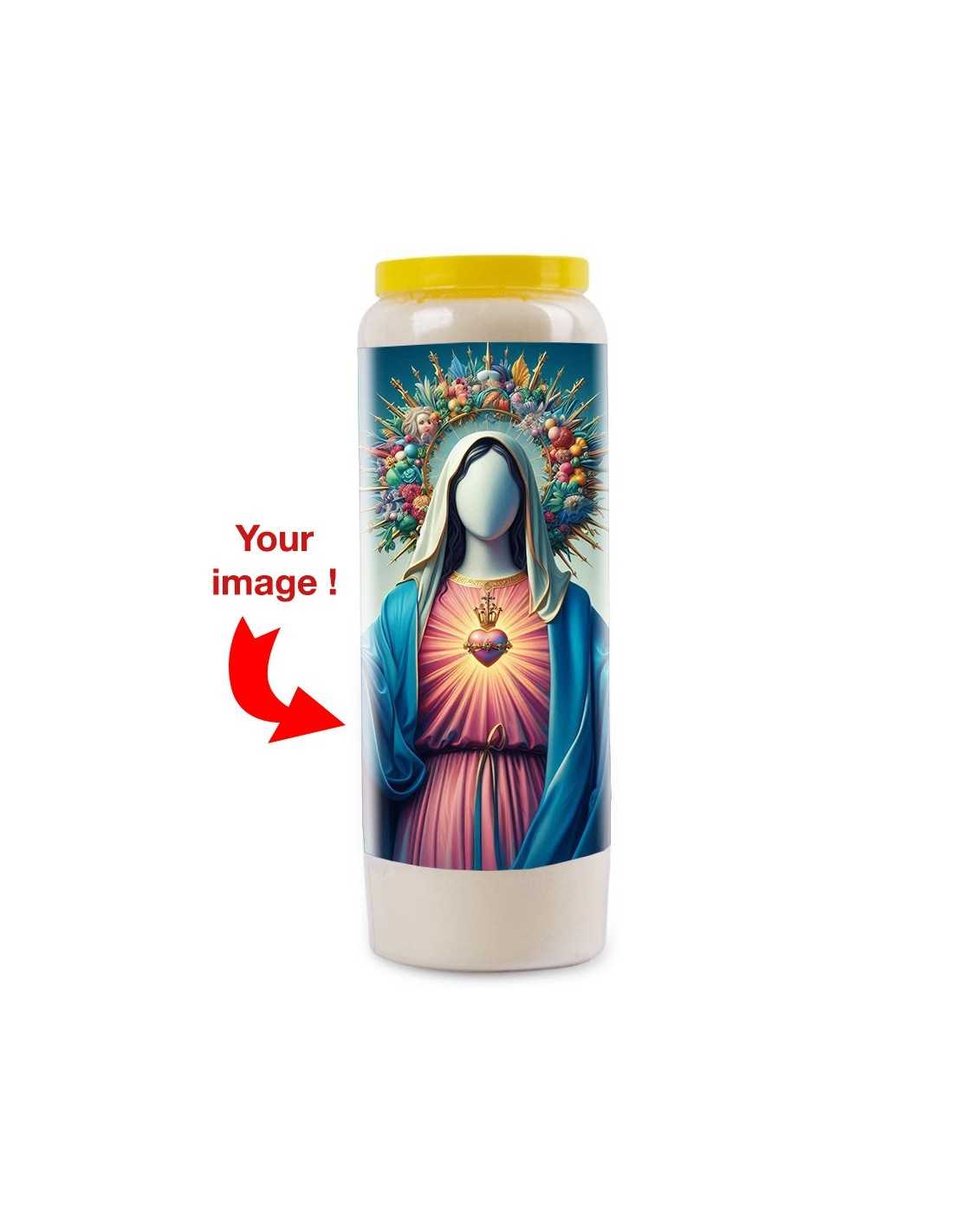 Personalize your novena candle with your face on the body of the Sacred Heart of Mary for a unique gift! Choose the color, upload your image and get a fun candle! Perfect for a gift, souvenir or special occasion.