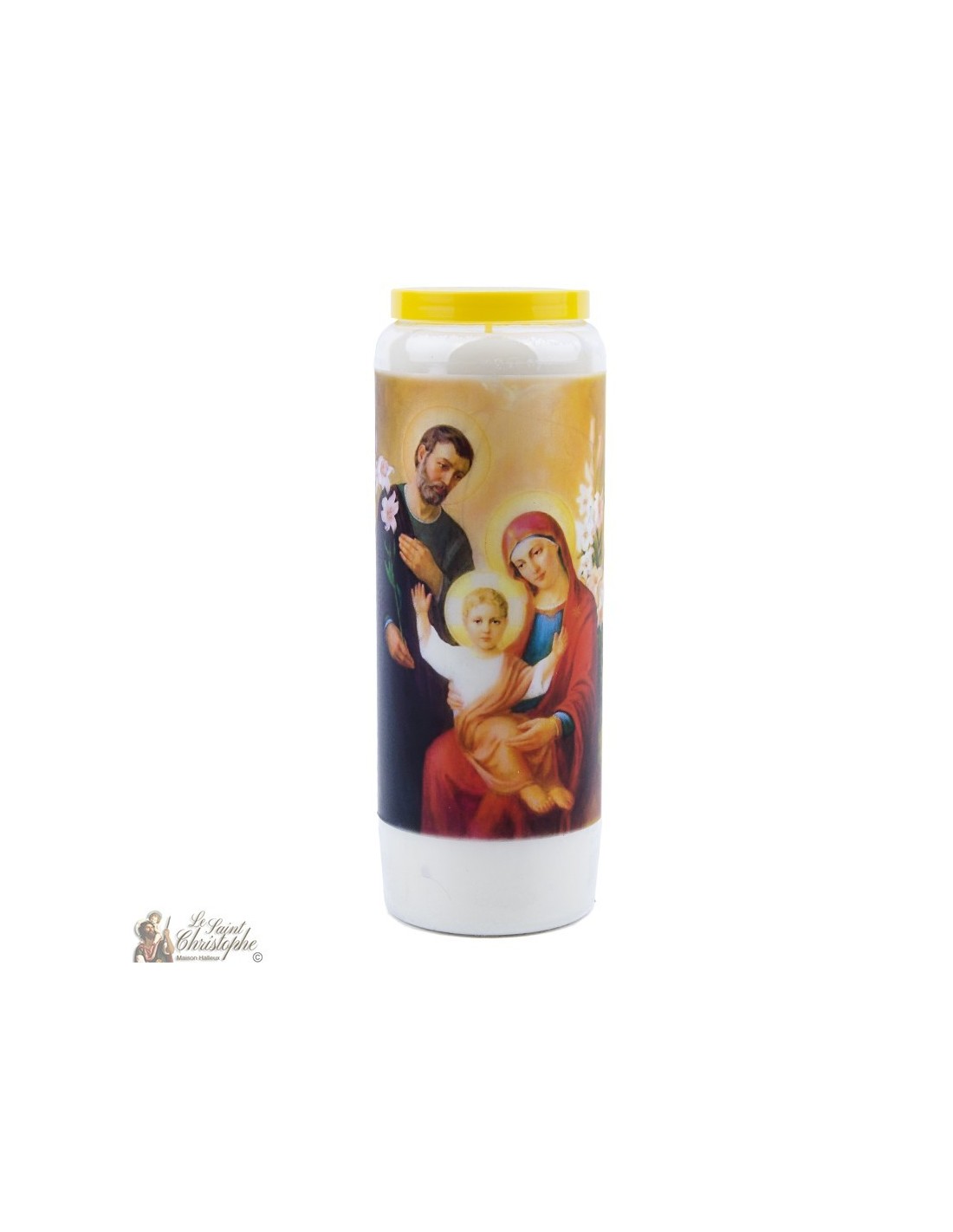 Novena candle with image of the Holy Family and prayer dedicated to her.