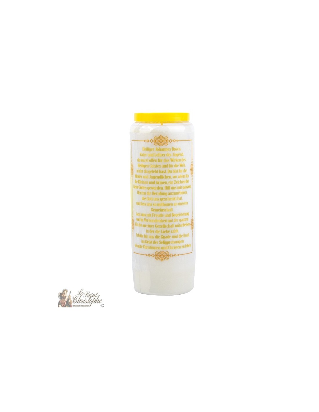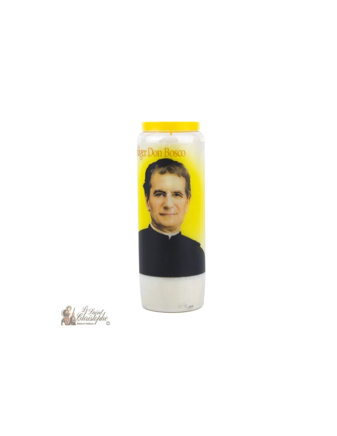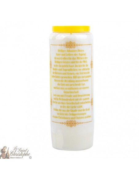 Novena candle with image of Don Bosco and prayer dedicated to him on the back.