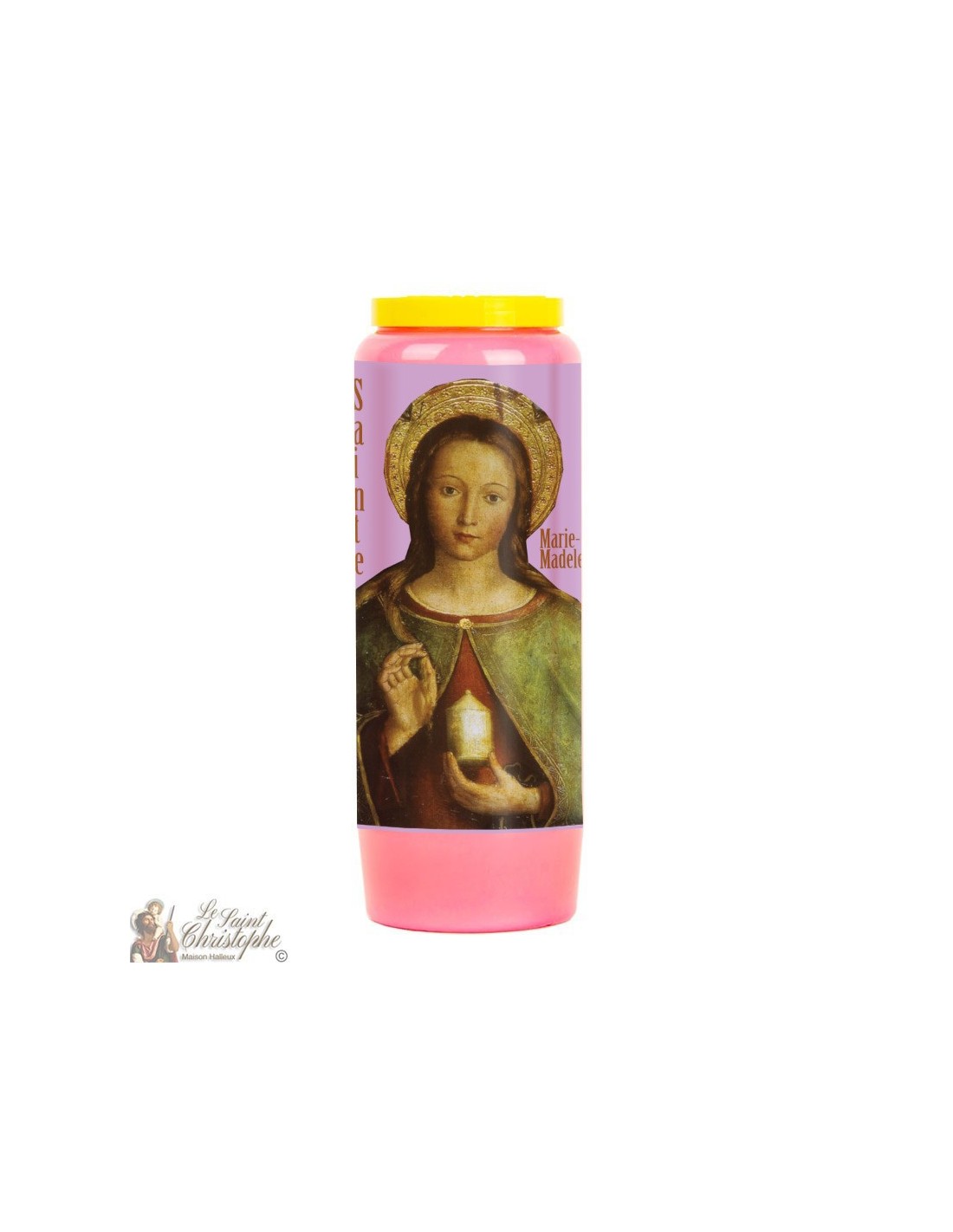 Pink novena candle with the image of St. Mary Magdalene and prayer dedicated to her.