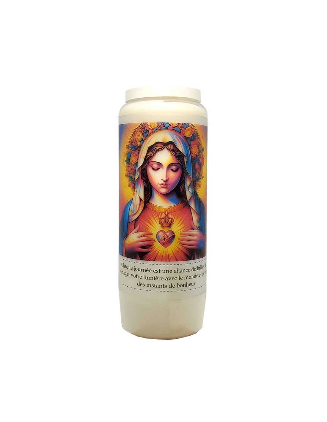 Novena candle with modern image of the Sacred Heart of Mary on a background of beautiful flowers, shimmering colors, and prayer on the back. In its heart, we see the Virgin and Child.