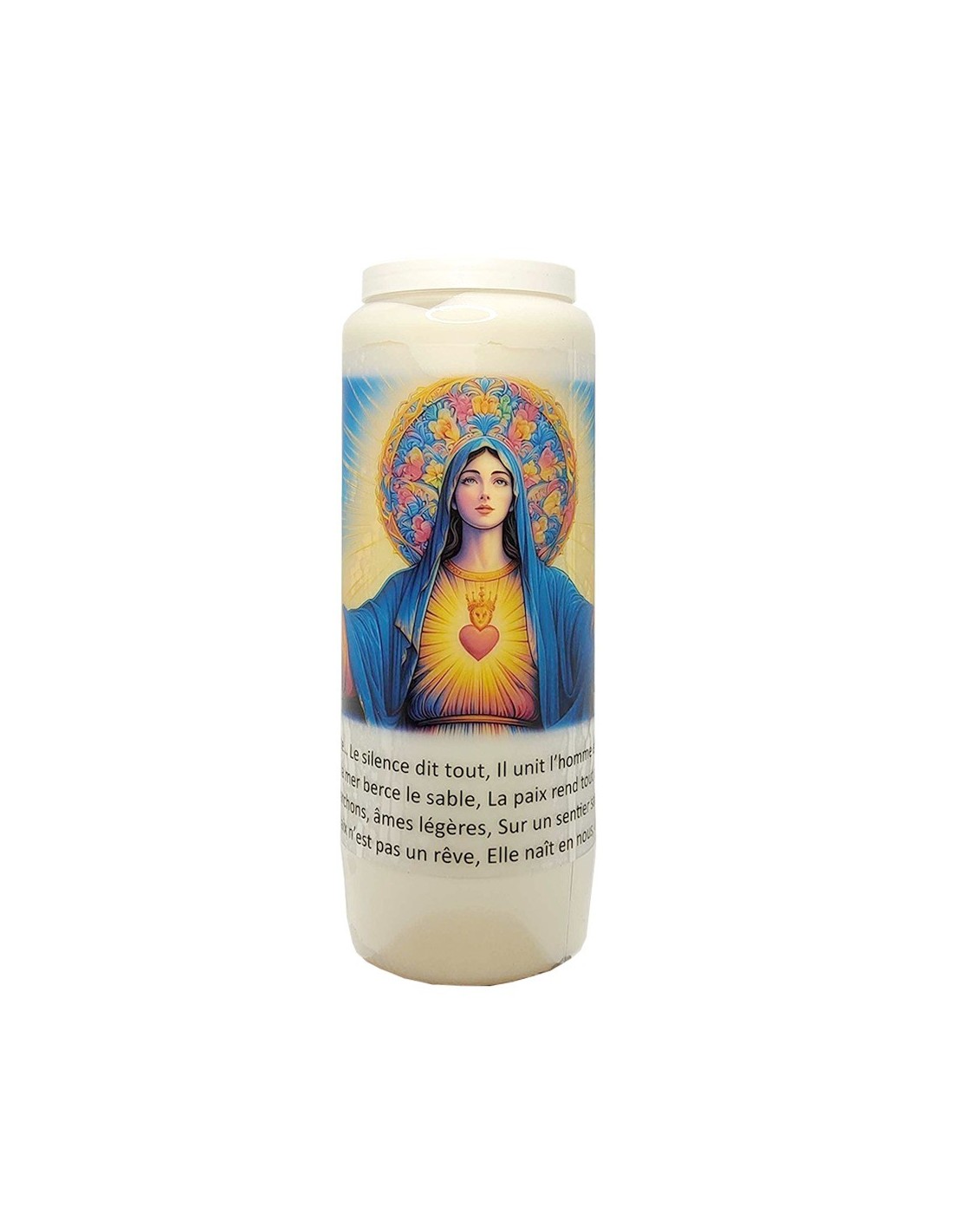 Novena candle with a modern image of the Sacred Heart of Mary on a beautiful bright blue sky, and prayer on the back. The Virgin Mary is depicted with a beautiful halo of flowers, opening her welcoming arms.