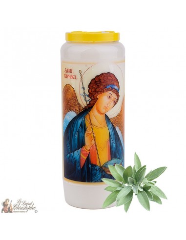 Vegetable novena candle with prayer picture to Saint Raphael and sage scented. A perfect combination for purification.