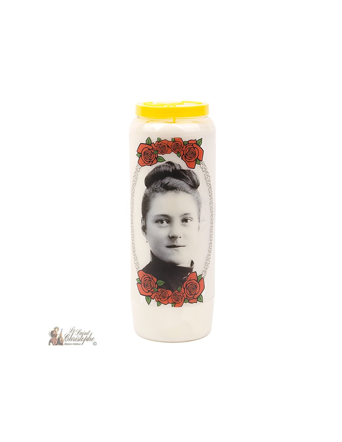 Plant novena candle with image of Saint Therese of Lisieux and prayer dedicated to her.