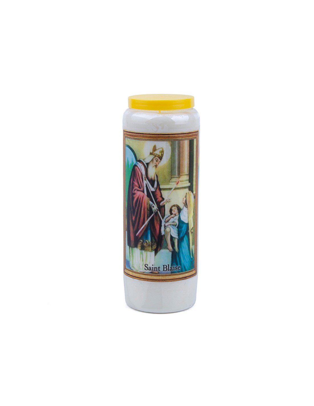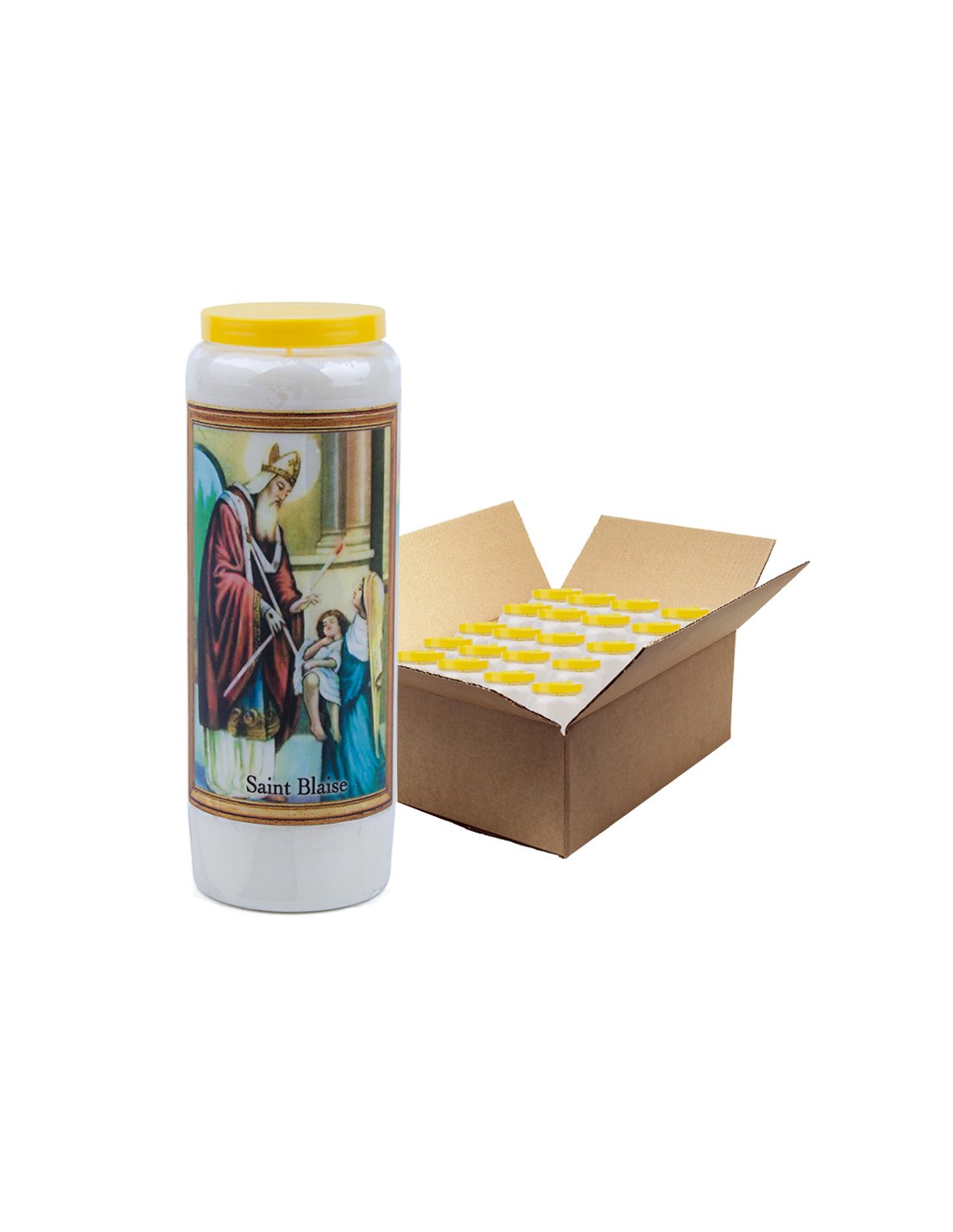 Box of 20 novena candles with the image of Saint Blaise and a prayer on the back.