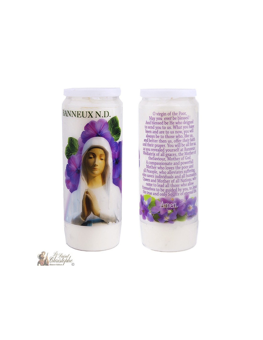 Vela de novena vegetal con la imagen de la Virgen de los Pobres de Banneux Notre-Dame y la oración en la espalda en el idioma de su elección.