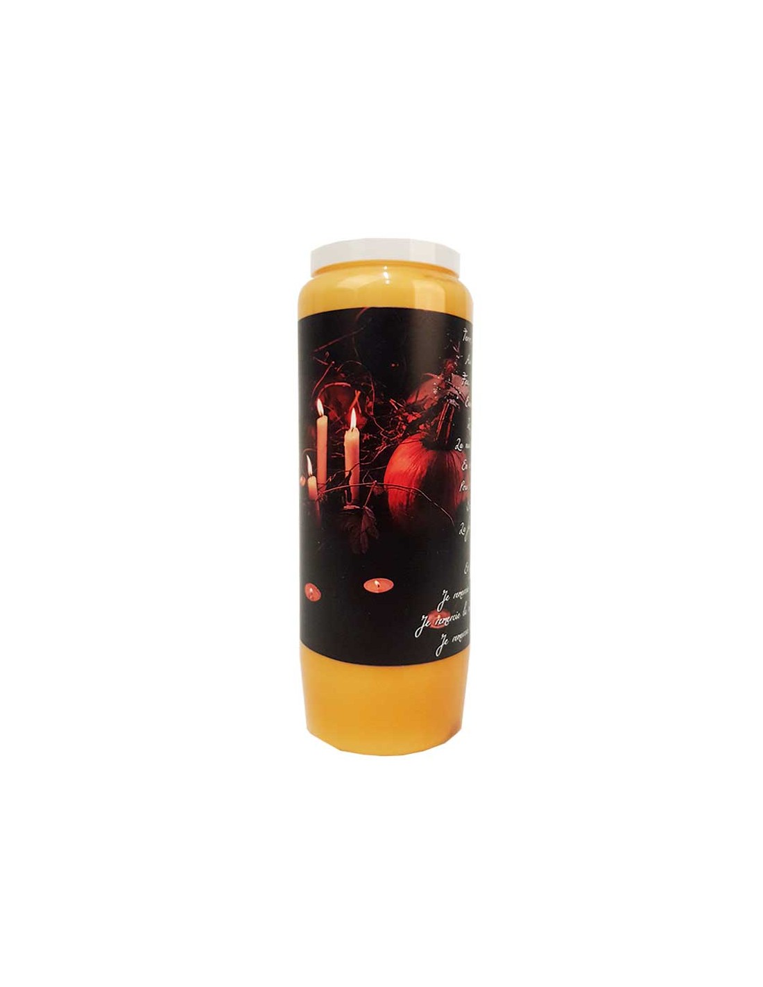 Velas de novena de color naranja con una imagen de calabazas y velas y una oración para Samhain.