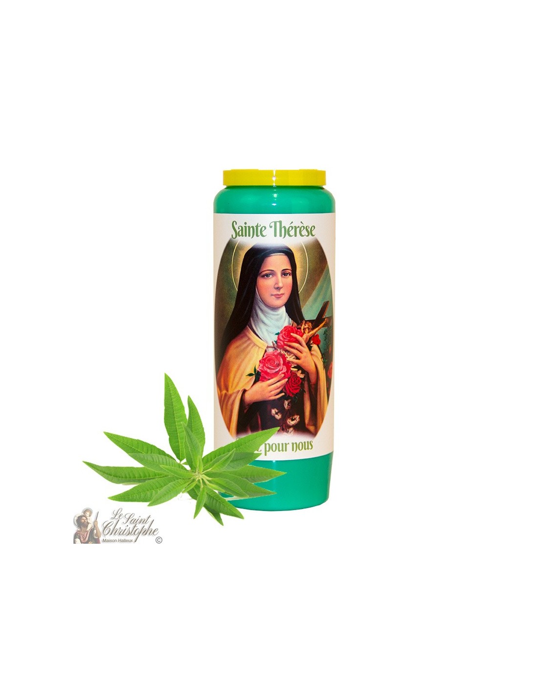 Genuina novena 100% vegetal perfumada con verbena con una imagen de Santa Teresa de Lisieux y una oración dedicada a ella, que arde 9 días (que arda día y noche).
