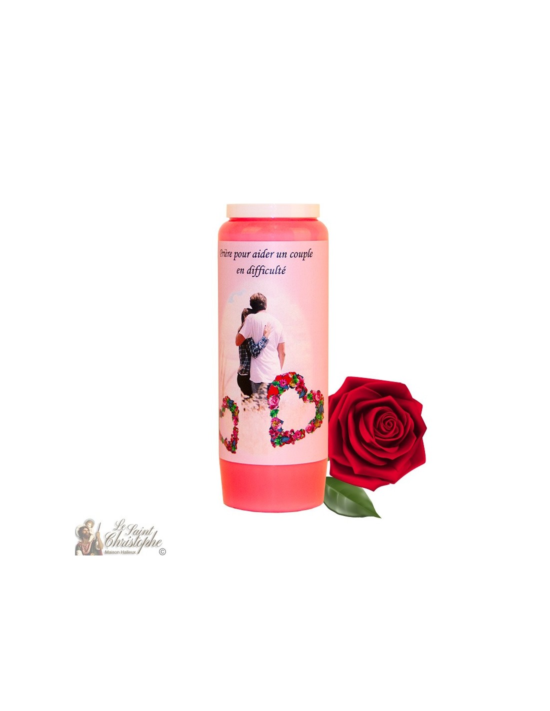 Vela de novena vegetal con imagen y oración para ayudar a las parejas en dificultades.
