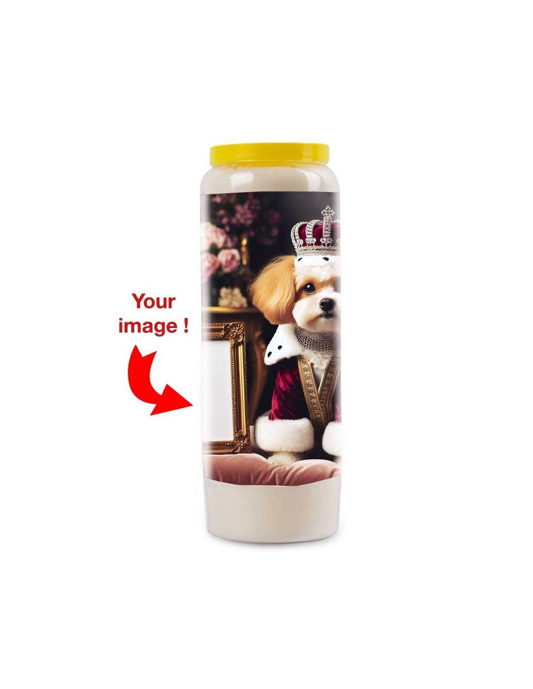 Añade un toque de elegancia y originalidad con esta vela de novena única. ¡Un guiño refinado y divertido para todos los amantes de los perros! Este modelo representa un perro shih tzu con traje real, con marco para personalizar.