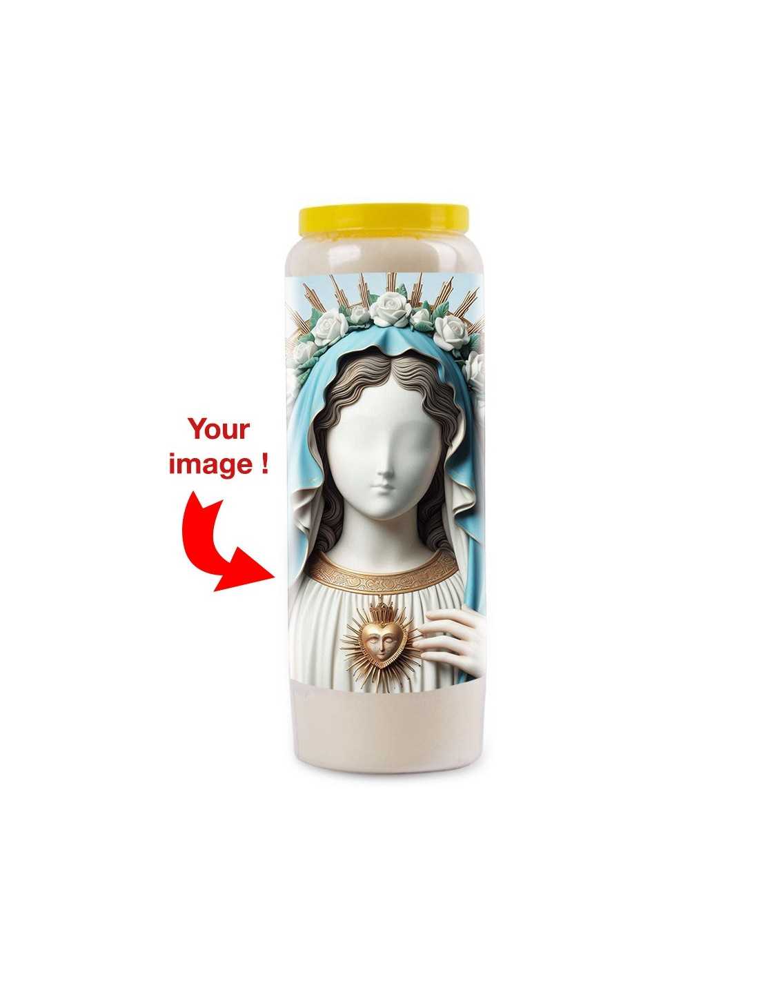 Vela de novena personalizable con tu rostro sobre el cuerpo del Sagrado Corazón de María, en suaves colores pastel, ¡para un regalo único! Elige el color, sube tu imagen y ¡consigue una vela divertida! Perfecta para regalo, recuerdo u ocasión especial. Encendido continuo durante 9 días. Fabricada con aceite vegetal. Dimensiones : 6 x 18 cm Peso : 520 gr