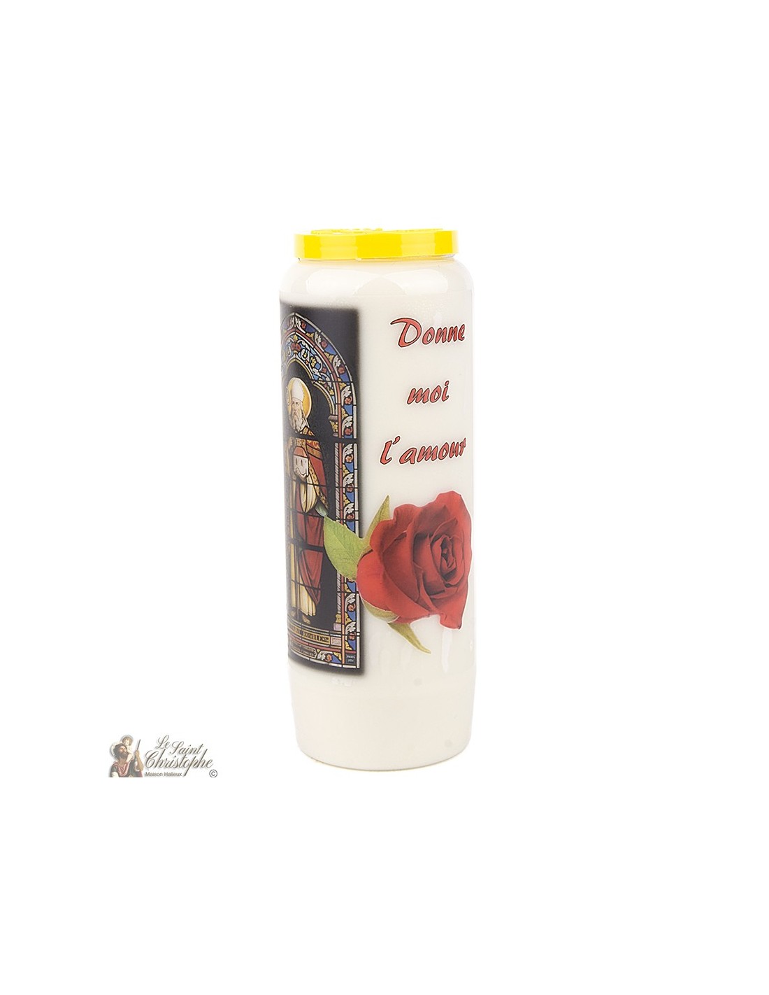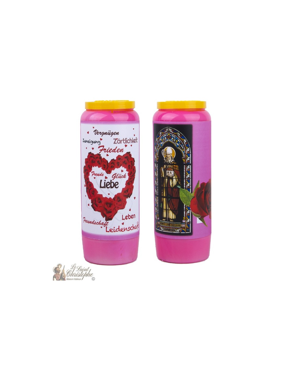 Vela de novena con la imagen de San Valentín con oración en el reverso por el amor de los novios.
