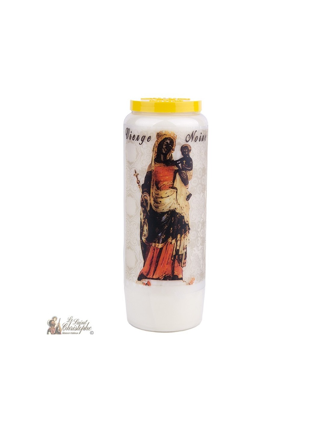 Vela de novena blanca con la imagen de la Virgen Negra y la oración dedicada a ellas.