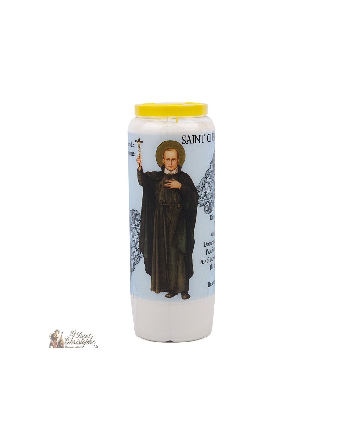 Vela de novena con imagen de San Clemente y oración dedicada a él en el reverso.