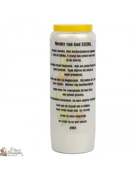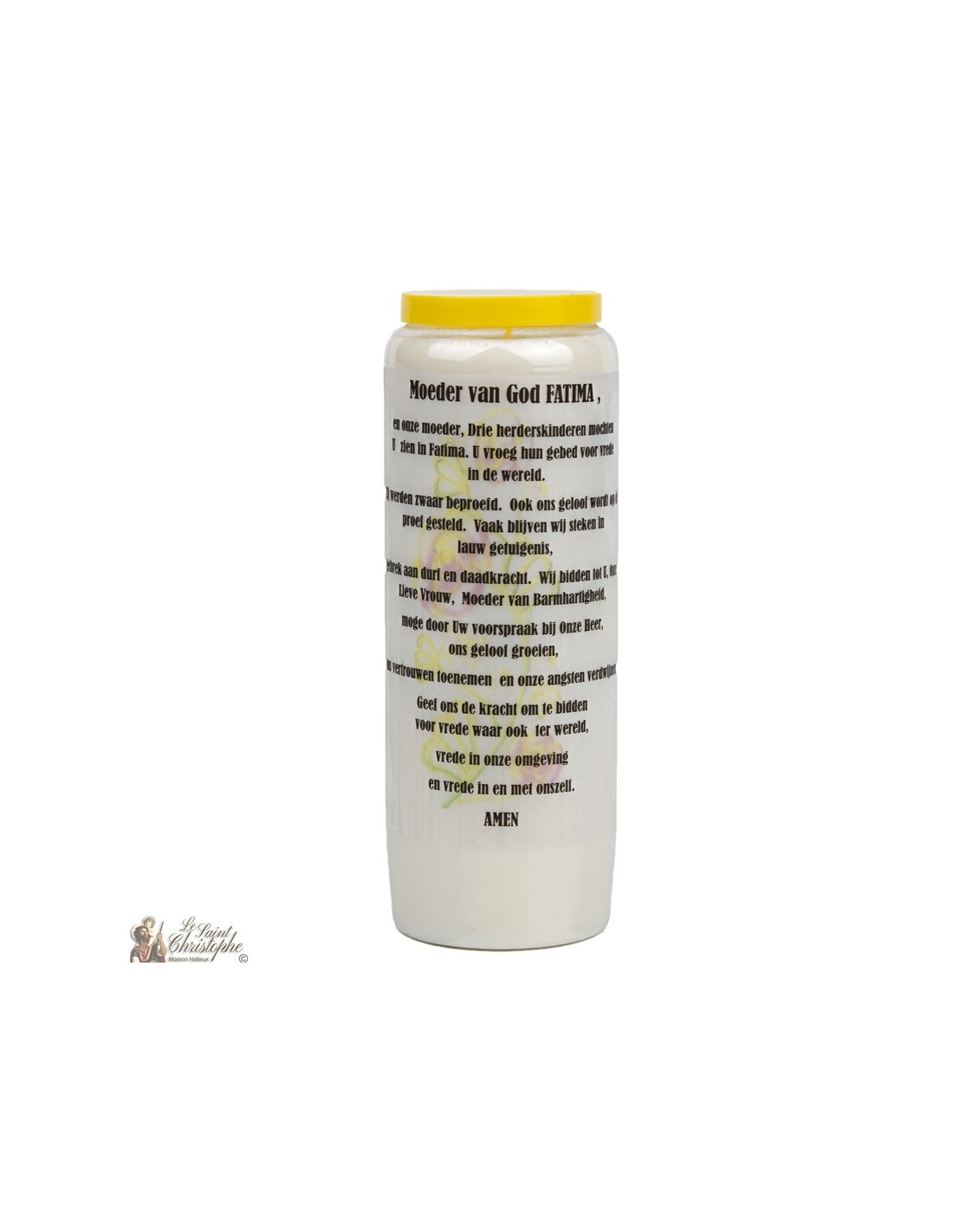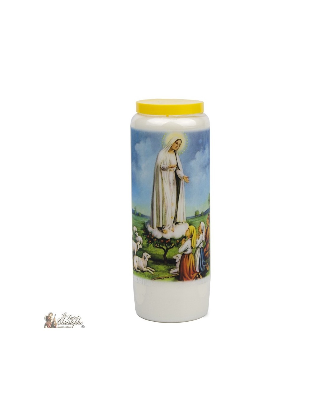 Vela de novena con la imagen de Santa Fátima y una oración dedicada a ella.