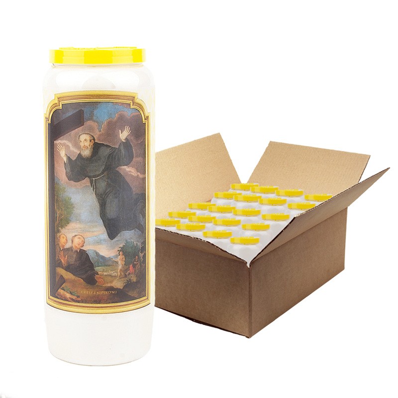 Vela de novena con imagen de Don Bosco y oración dedicada a él en el reverso.