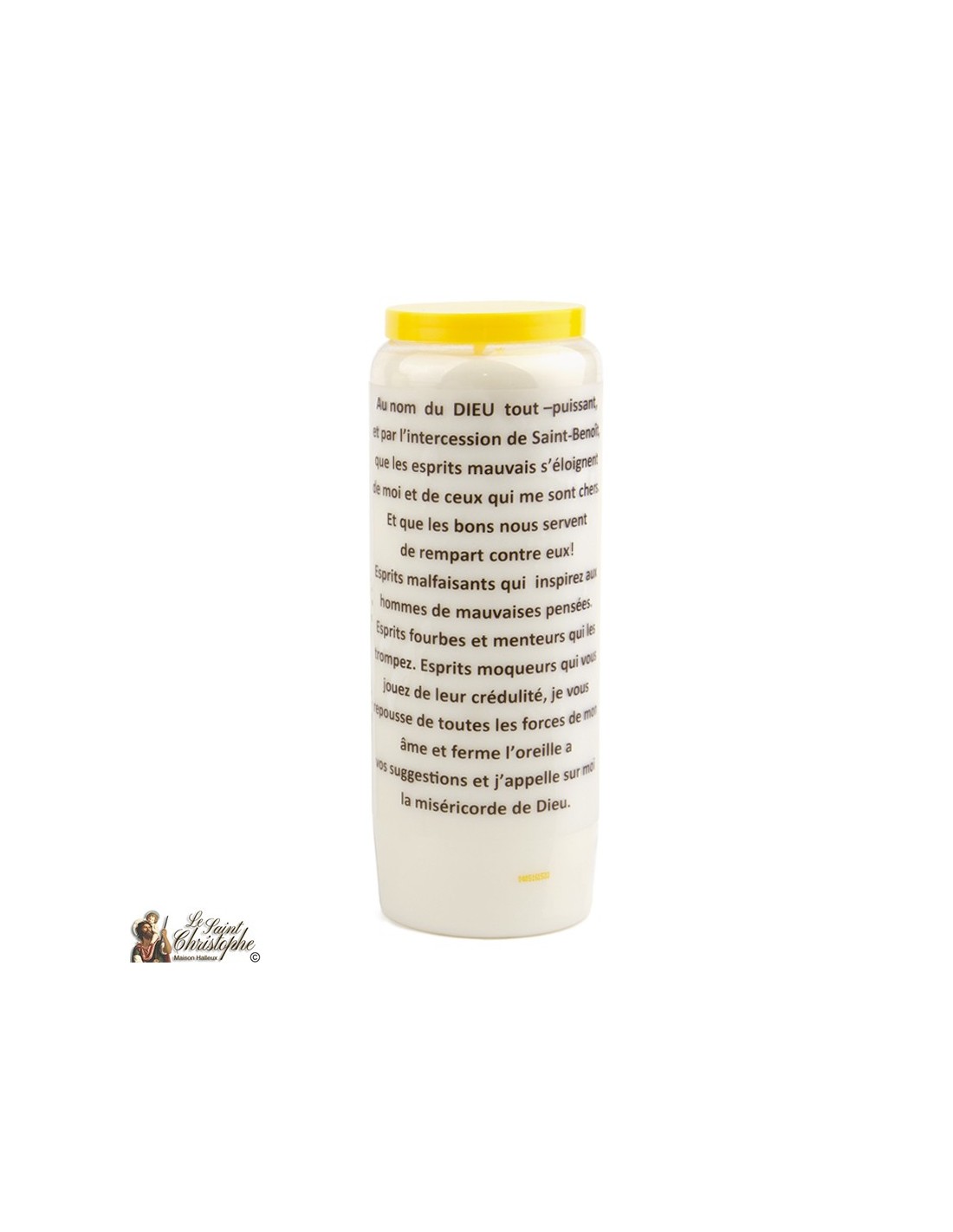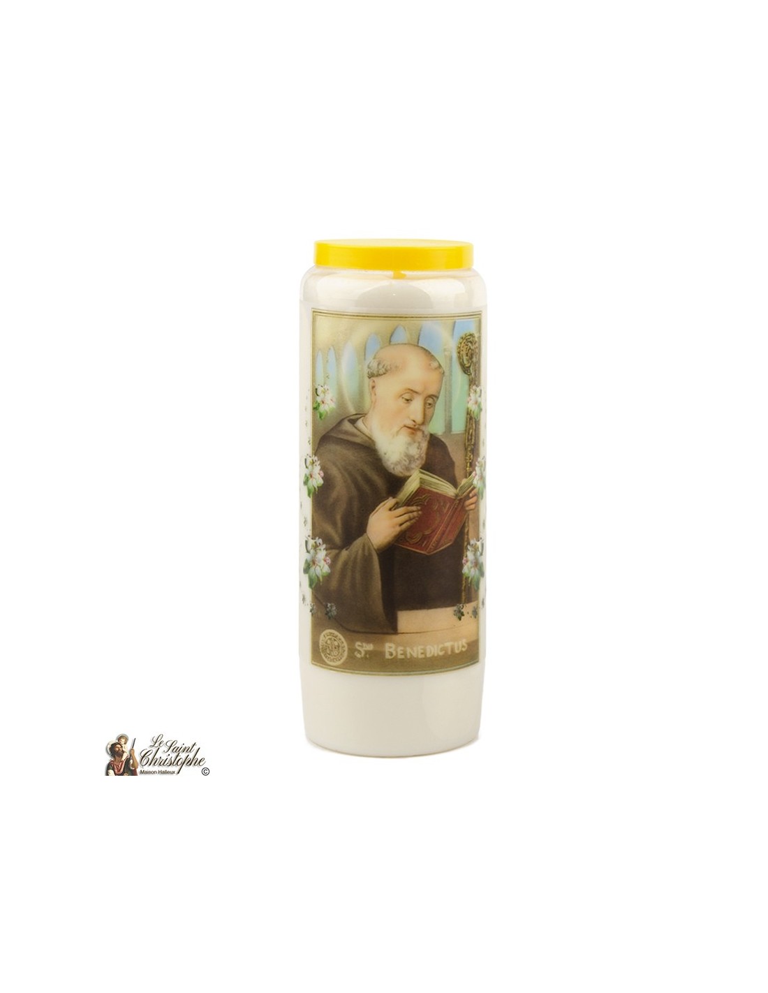 Vela de novena blanca con la imagen de San Benito y una oración dedicada a él.