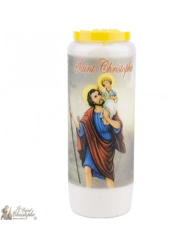 Vela de novena blanca con la imagen de San Cristóbal y una oración dedicada a él.