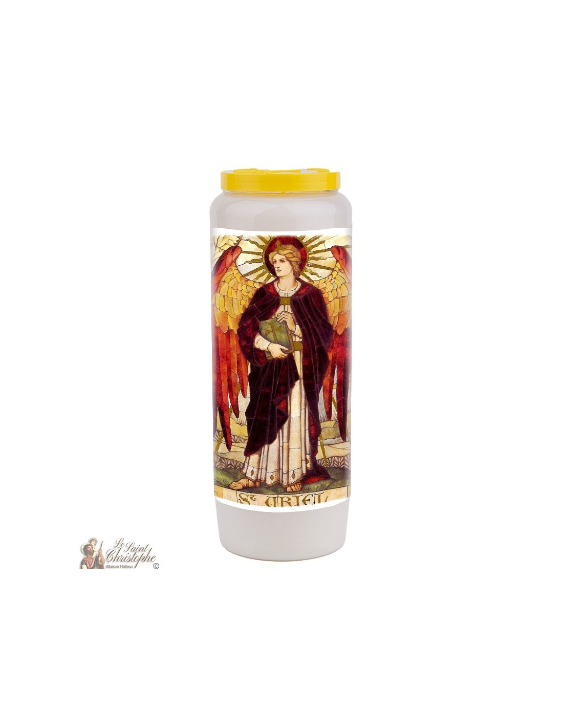 Vela de novena vegetal con una imagen de San Uriel y una oración dedicada a él en la parte posterior.