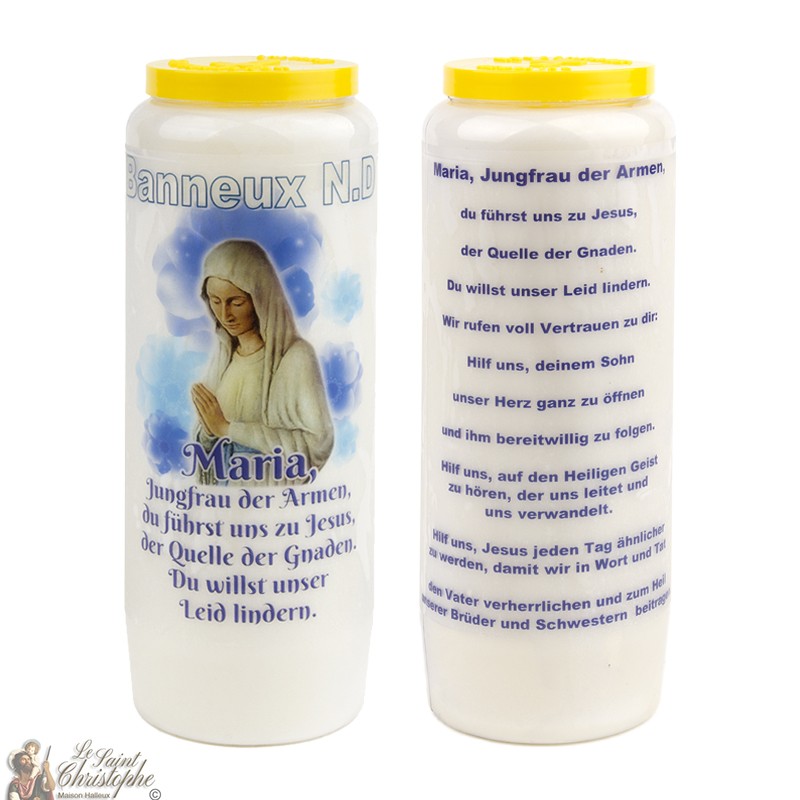 Vela de novena con la imagen de una joven rezando a la Santísima Virgen y el rezo del Ave María en el reverso.