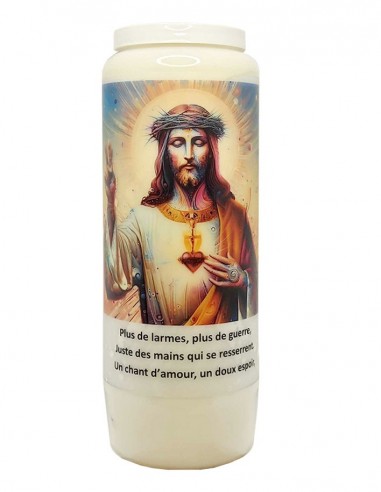 Vela de novena con imagen moderna del Sagrado Corazón de Jesús sobre fondo abstracto con colores brillantes y oración en el reverso. Se muestra a Cristo levantando su mano derecha en símbolo de la paz.