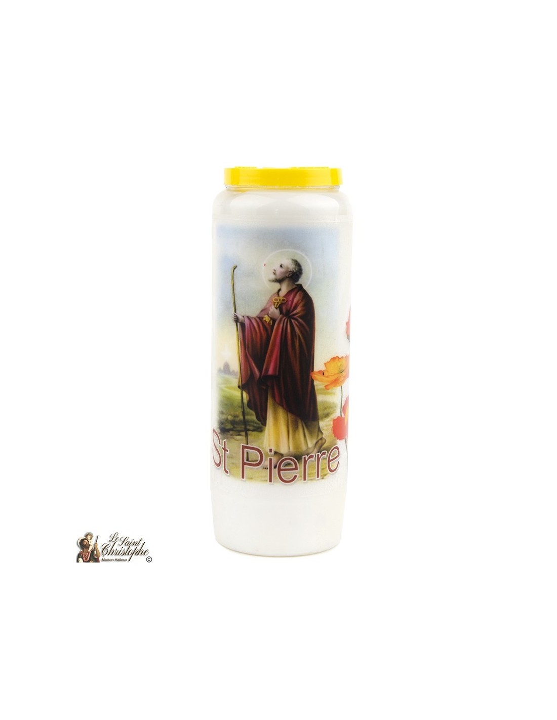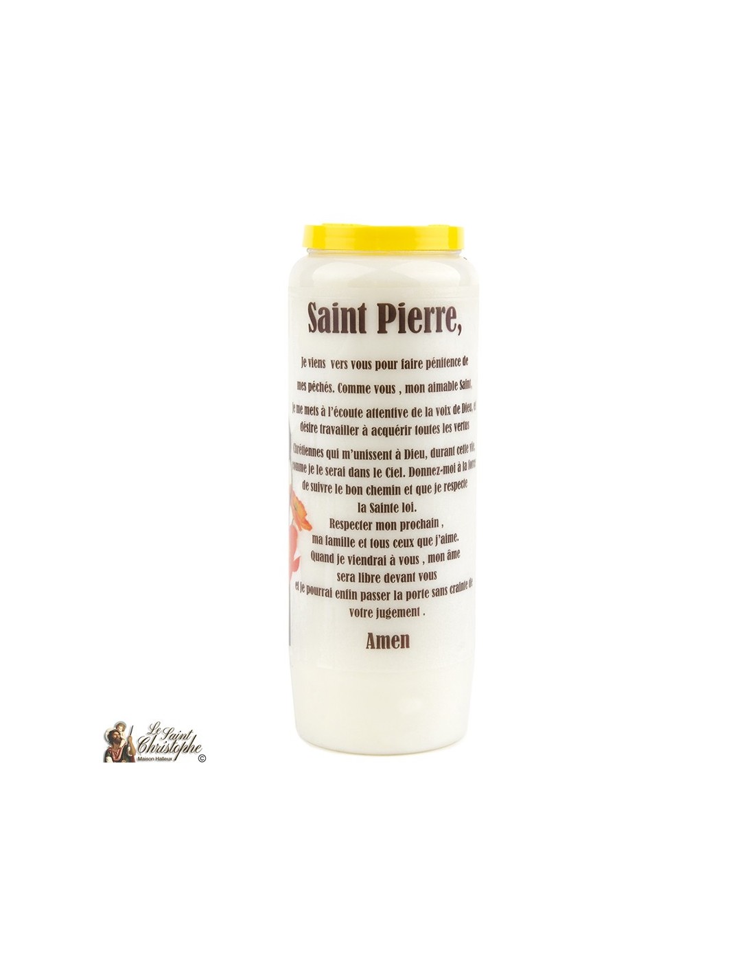 Vela de novena con imagen de San Pedro y oración en el reverso.