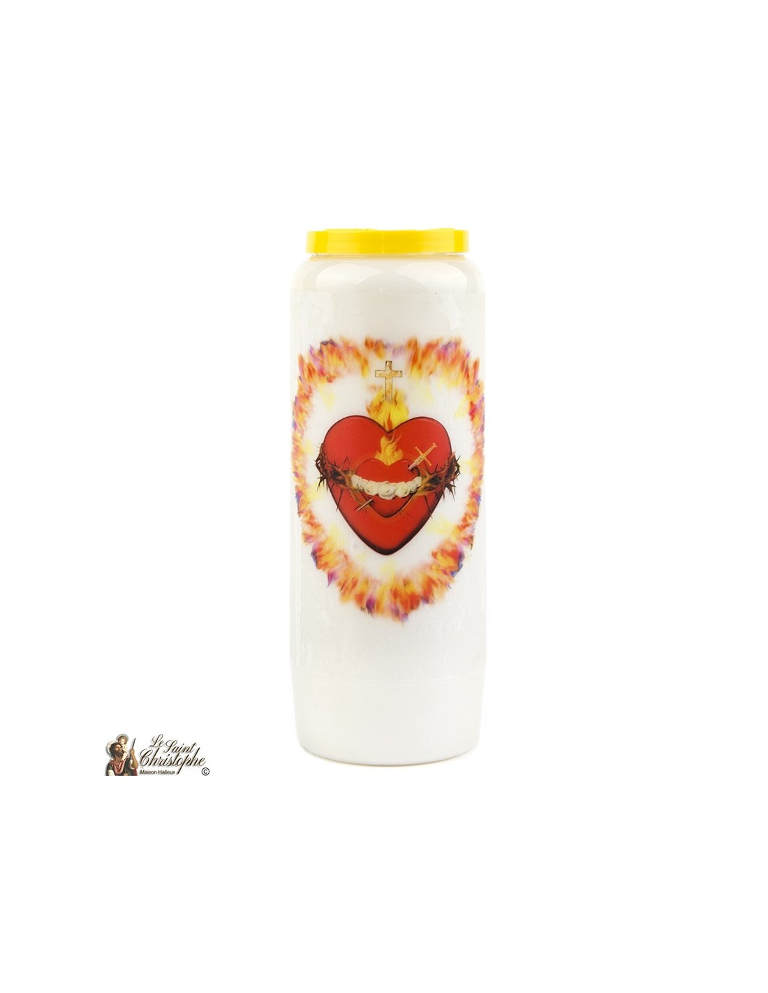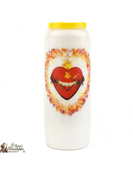 Vela de novena con la imagen del Sagrado Corazón en el anverso y una oración en el reverso por un ser querido.