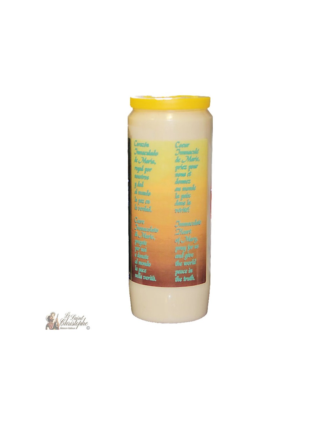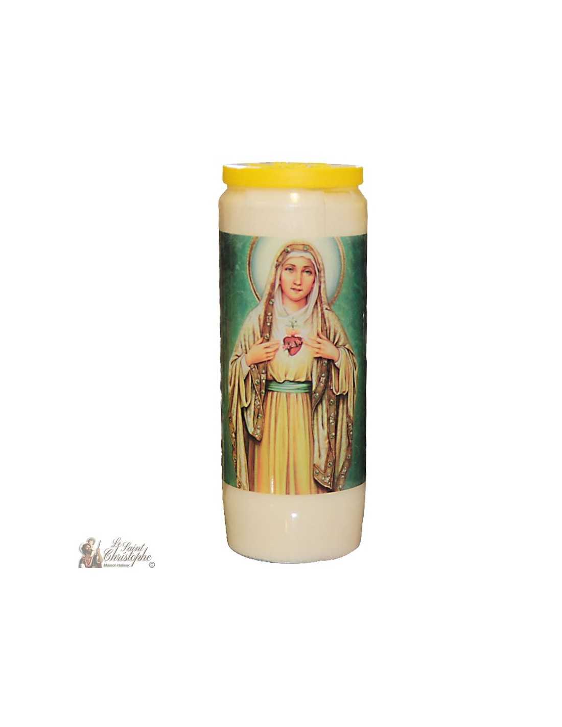 Bougie de neuvaine blanche avec image du Sacré Cœur de Marie et prière qui lui est dédiée.
