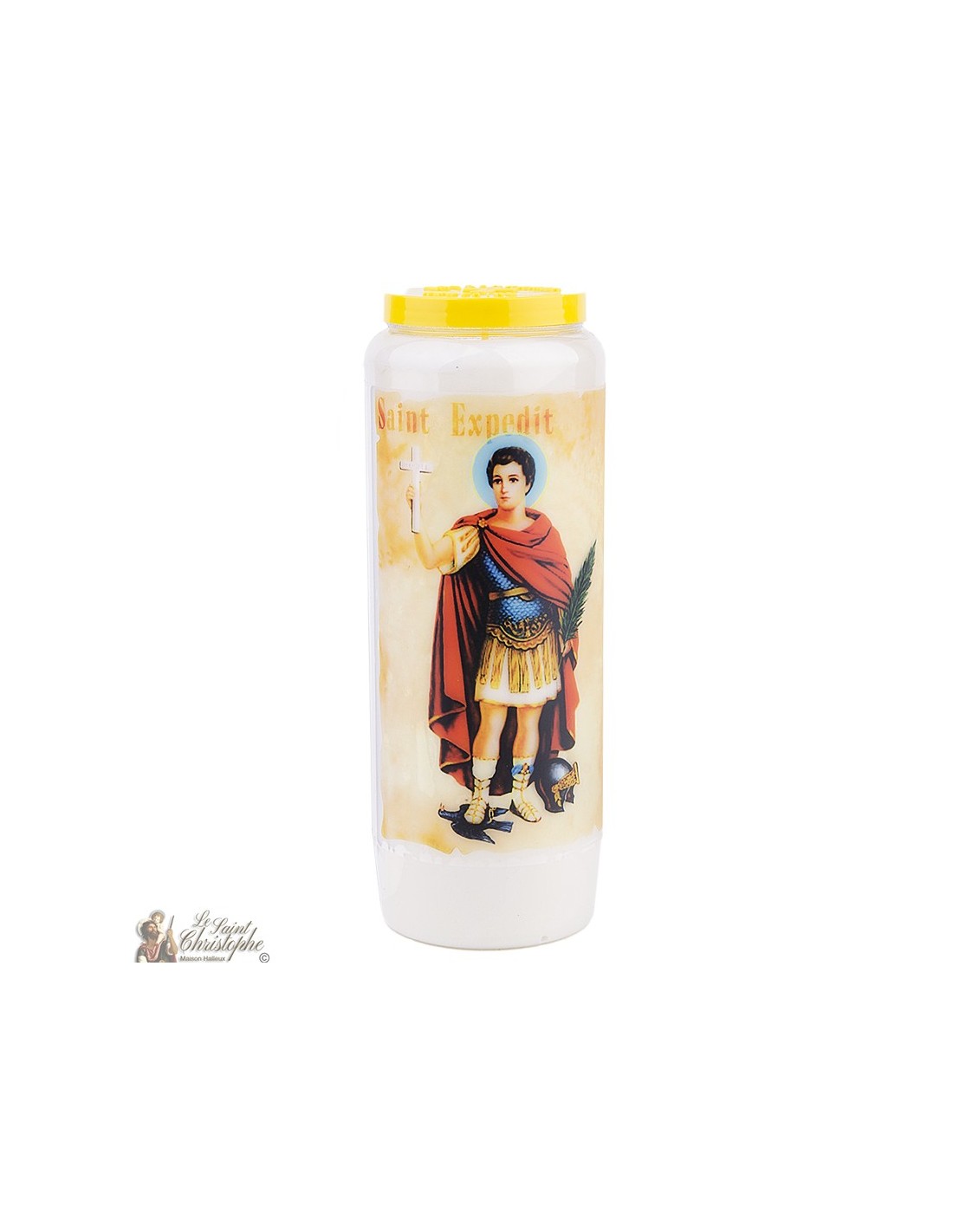 Bougie neuvaine végétale avec image de Saint Expedit et prière qui lui est dédiée.