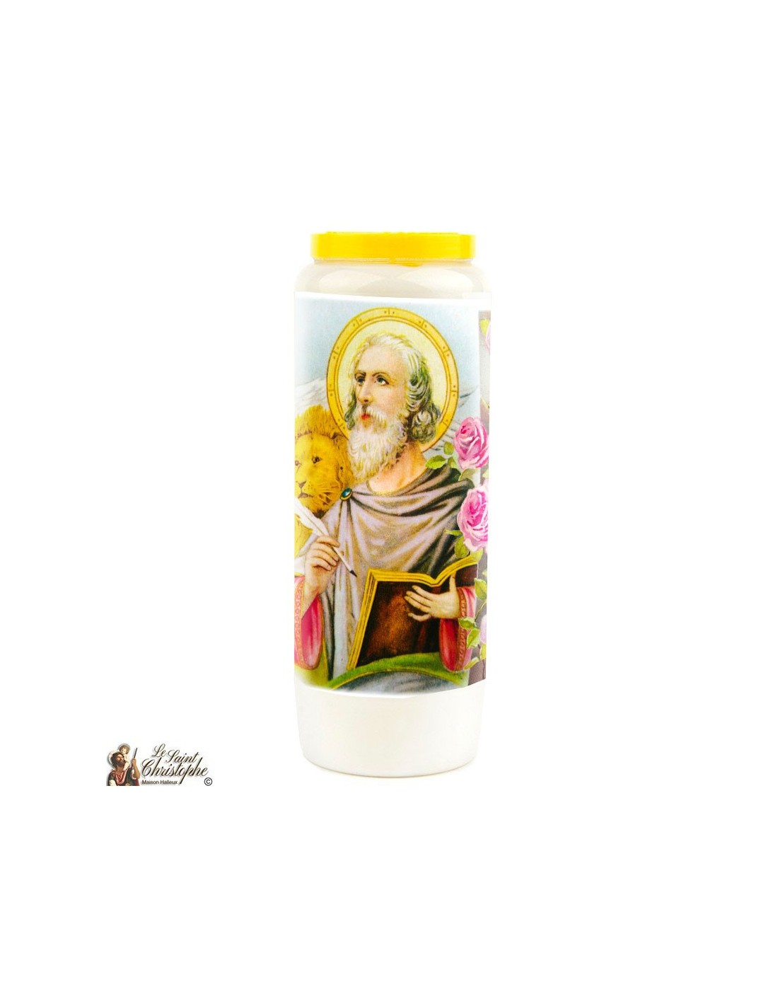 Bougie neuvaine végétale avec image de Saint Marc et prière qui lui est dédiée.