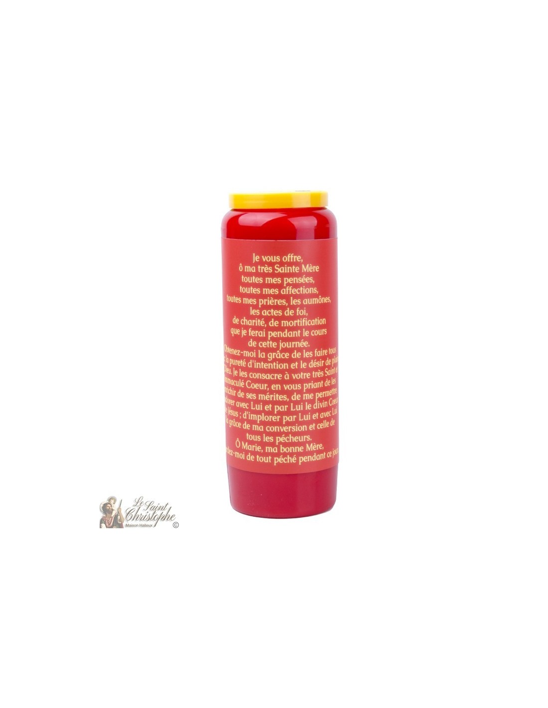 Bougie de neuvaine rouge avec image du Sacré Cœur de Marie avec prière qui lui est dédiée au dos de la bougie.