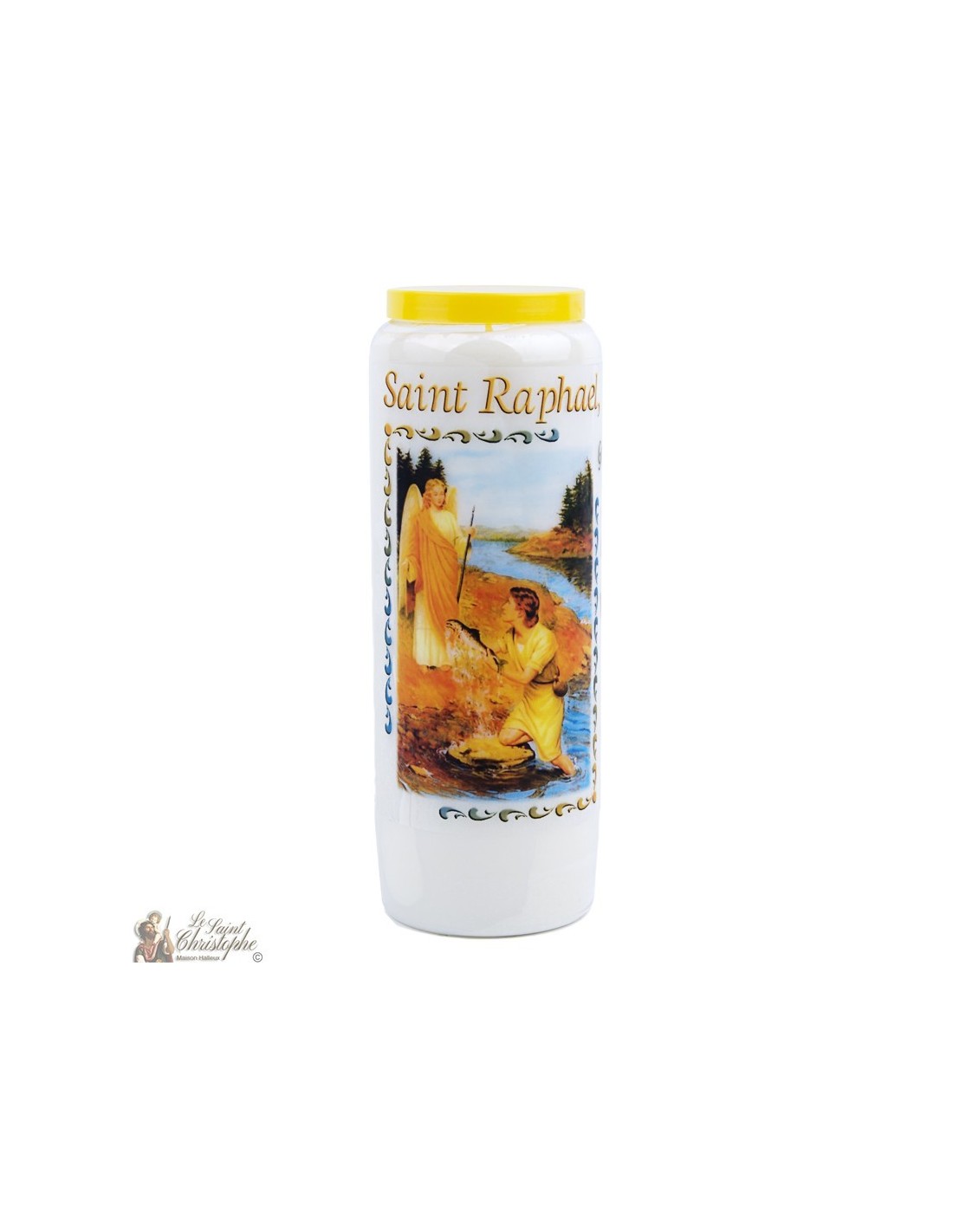 Bougie de neuvaine avec image de Saint Raphaël et prière qui lui est dédiée.