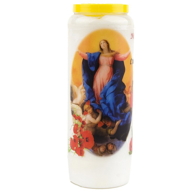 Bougie de neuvaine avec image de Sainte Fatima et prière qui lui est dédiée.